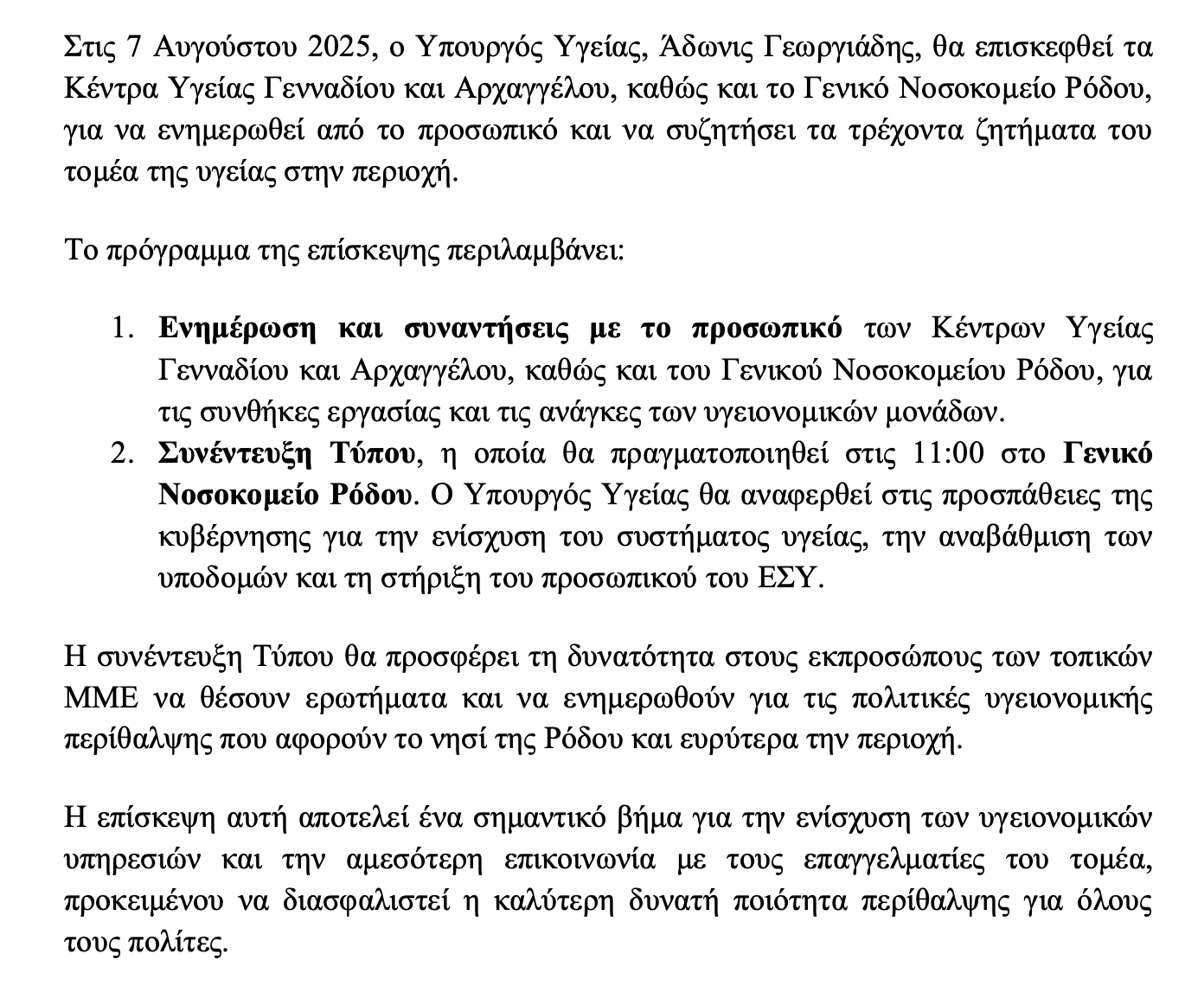 Ανακοίνωση προγράμματος επίσκεψης του Αδωνι Γεωργιάδη στη Ρόδο