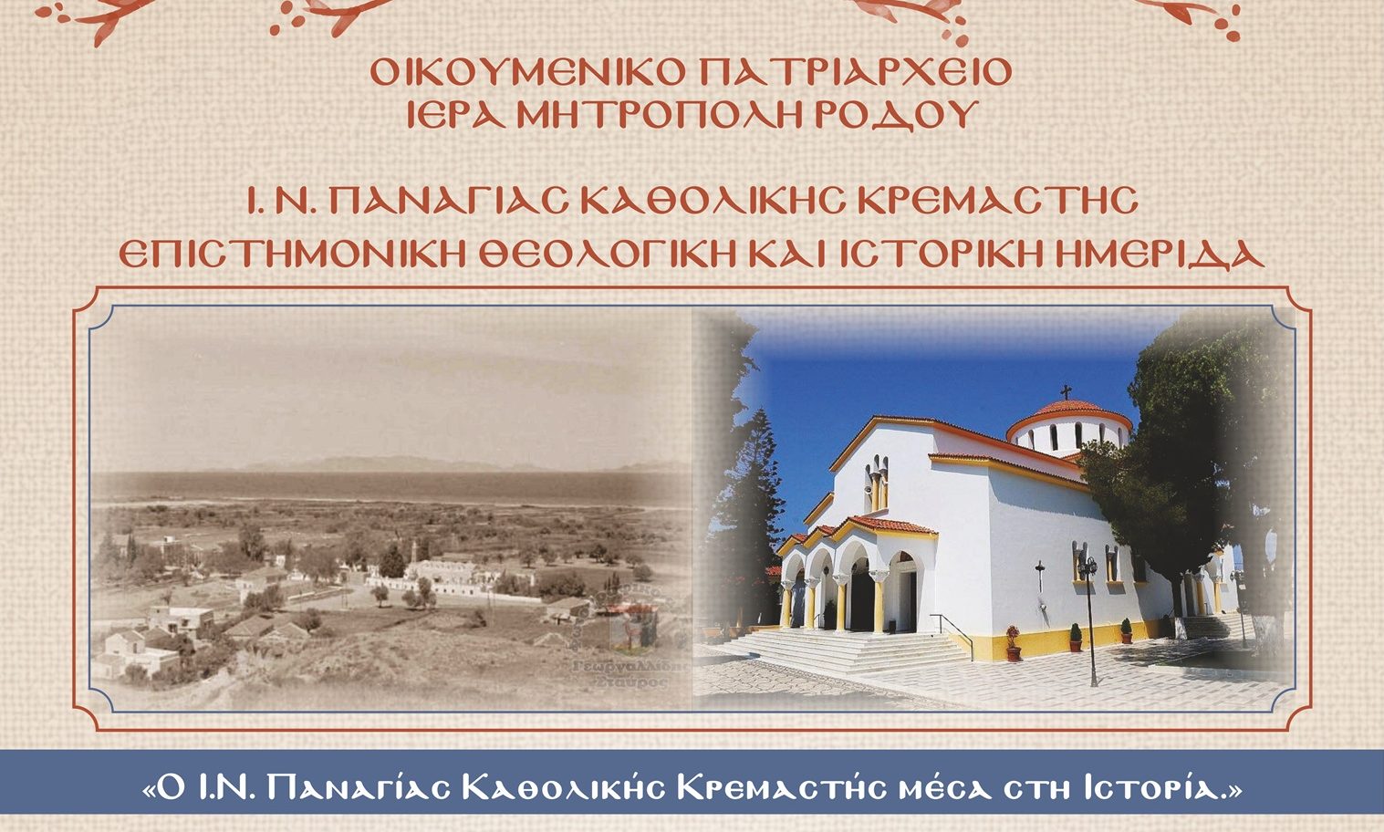 Θέμα: «Ιχνηλατώντας τη ιστορική διαδρομή του Ι.Ν. Παναγίας Καθολικής. Η φιλάνθρωπη προσφορά του «Παλαιού» ναού (1839) & τα αίτια ανοικοδομήσεως του νέου ναού(1956-1960)».
