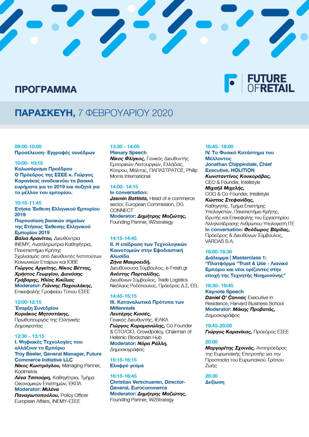 Χαρακτηριστικές θα είναι οι κεντρικές ομιλίες που θα πραγματοποιηθούν από τους δύο keynote speakers κ.Dan O‘ Connor, Executive in Residence,Harvard Business School και τον κ.Jonathan Reynolds,Director, Oxford Institute of Retail Management, Said Business School, University of Oxford, UΚ, την Παρασκευή 7 και το Σάββατο 8 Φεβρουαρίου αντίστοιχα, ενώ master classes,plenary speeches, panels και συζητήσεις πρόκειται να εστιάσουν σε εξειδικευμένα θέματα που απασχολούν πολλούς κλάδους του Λιανεμπορίου.