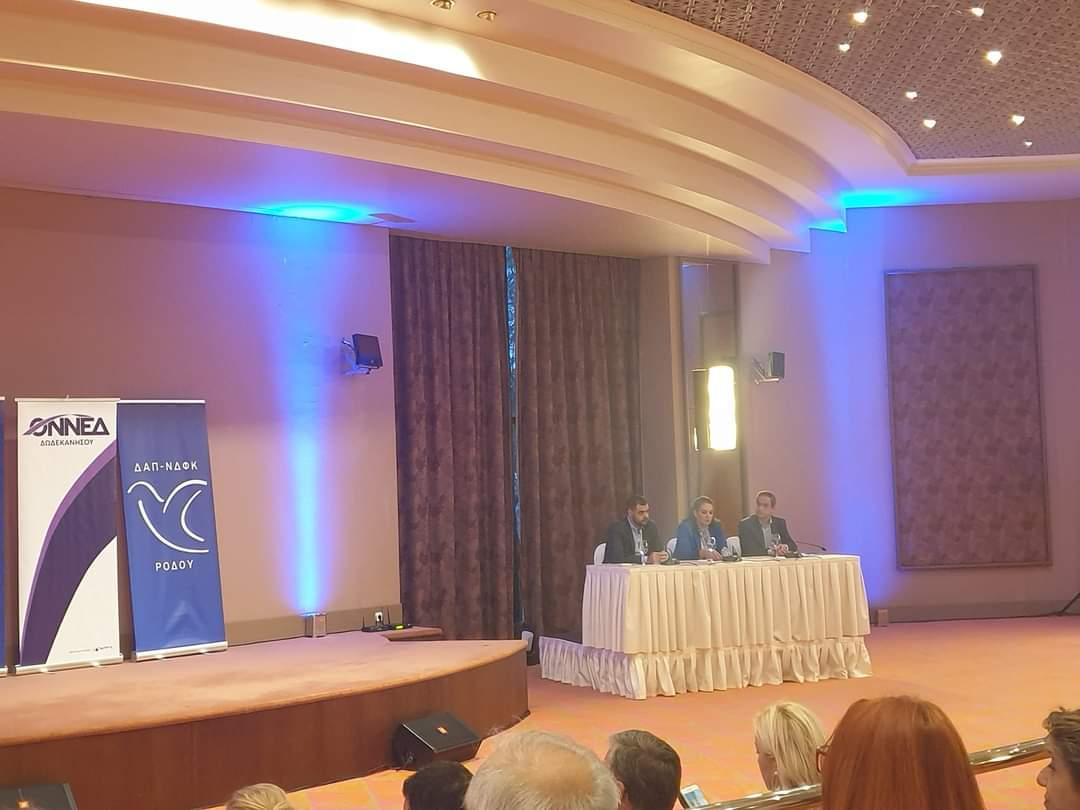 Χαιρετισμό απηύθυναν η Πρόεδρος της ΔΕΕΠ Δωδεκανήσου Νέας Δημοκρατίας Έφη Χαραλαμποπούλου, η οποία διηύθυνε τη συζήτηση, ο Πρόεδρος της ΔΗΜΤΟ Ρόδου Αντώνης Αρφαράς, η Πρόεδρος της ΟΝΝΕΔ Δωδεκανήσου Βιβή Παπαδοπούλου, οι Βουλευτές του Νομού Δωδεκανήσου Μάνος Κόνσολας και Βασίλης Υψηλάντης,ο Περιφερειάρχης Νοτίου Αιγαίου Γιώργος Χατζημάρκος, ο Δήμαρχος Ρόδου Αντώνης Καμπουράκης, ο Οργανωτικός Γραμματέας Τοπικής Αυτοδιοίκησης και Διαχείρισης Κρίσεων Μένιος Κορομηλάς και το μέλος της Π.Ε. Νέας Δημοκρατίας Μηνάς Νικολάου.