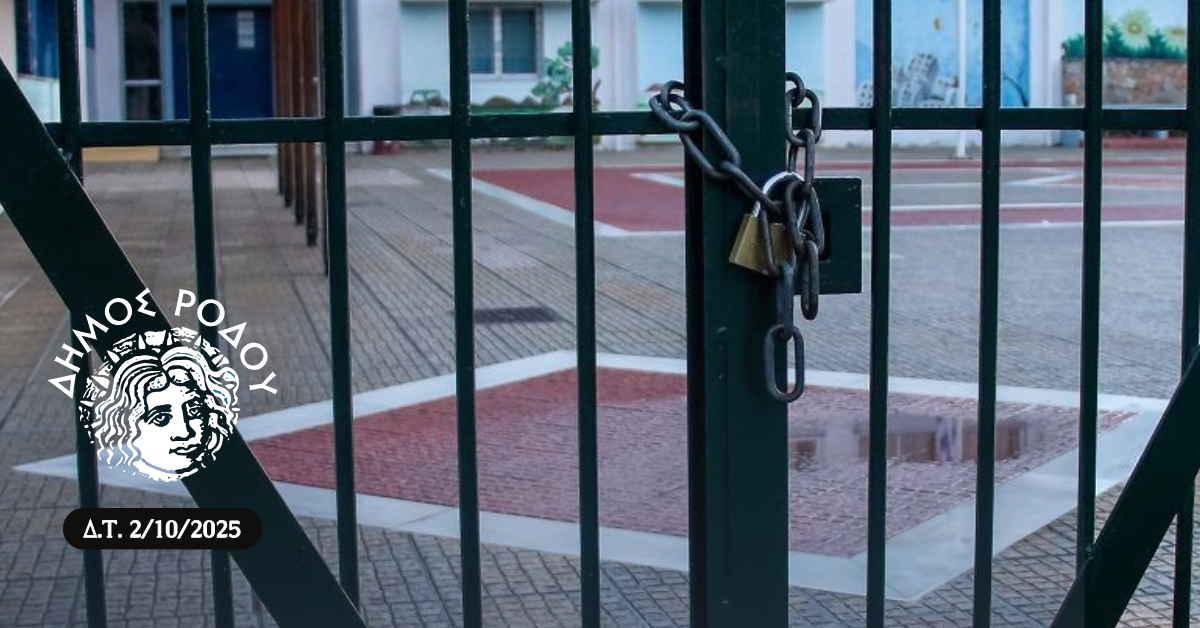 Με απόφαση του Δημάρχου Ρόδου Αλέξανδρου Κολιάδη, αύριο Παρασκευή 3 Οκτωβρίου δεν θα λειτουργήσουν οι σχολικές μονάδες όλων των βαθμίδων στο νησί.