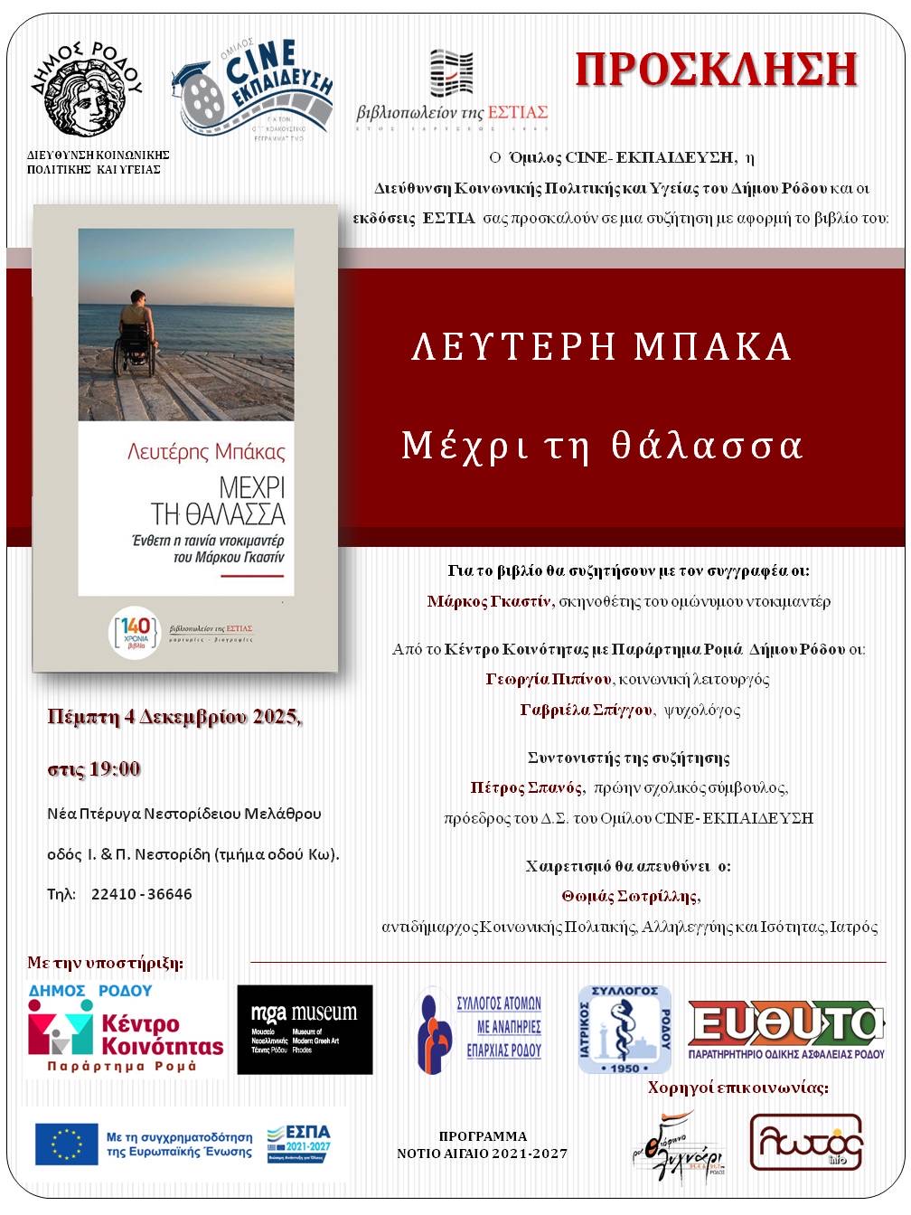 Την Πέμπτη 4 Δεκεμβρίου 2025, στις 19:00, στη Νέα Πτέρυγα Νεστορίδειου Μελάθρου, θα παρουσιαστεί το βιβλίο του Λευτέρη Μπάκα “Μέχρι τη Θάλασσα”, μια συγκλονιστική κατάθεση ψυχής που συνοδεύει την ομώνυμη ταινία-ντοκιμαντέρ του σκηνοθέτη Μάρκου Γκαστίν. Ένα έργο βαθιά ανθρώπινο, που αναδεικνύει τις προκλήσεις, τα όνειρα και την ελευθερία μέσα από το ταξίδι ενός ανθρώπου με αναπηρία μέχρι την ακροθαλασσιά της δικής του δύναμης, όπως ομολογεί ο ήρωας: «Η αναπηρία δεν με εμπόδισε να ονειρεύομαι. Με ανάγκασε απλώς να ονειρεύομαι πιο γενναία».