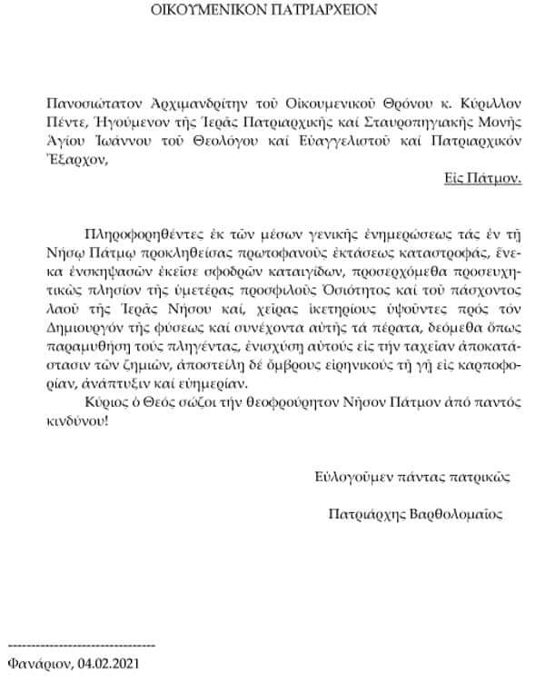 Μήνυμα συμπαράστασης του Οικουμενικού Πατριάρχη προς τους κατοίκους της Πάτμου