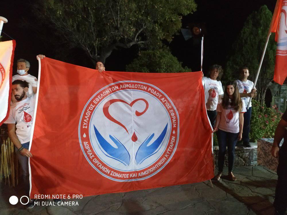 Ακολούθησε η σημαία του Συλλόγου των Εθελοντών Αιμοδοτών Ρόδου, οι σημαίες της αιμοδοσίας και το λάβαρο, που με περισσή περηφάνια κράτησαν νέοι εθελοντές αιμοδότες πλαισιωμένοι από εκατοντάδες αναμμένες δάδες που κρατούσε ο συγκεντρωμένος κόσμος.