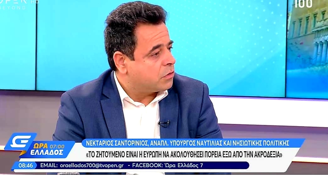 Ο Αναπληρωτής Υπουργός Ναυτιλίας και Νησιωτικής Πολιτικής παρευρέθηκε σήμερα στο studio της εκπομπής OPEN Beyond στην εκπομπή «ΩΡΑ ΕΛΛΑΔΟΣ 7.00», με τους δημοσιογράφους Ιορδάνη Χασαπόπουλο και Γιάννη Σαραντάκο. Ο Νεκτάριος Σαντορινιός αναφέρθηκε στο διακύβευμα των ευρωεκλογών και τον αγώνα για μια προοδευτική πορεία στην Ευρώπη ενάντια στην άνοδο της ακροδεξιάς και του ρατσισμού.