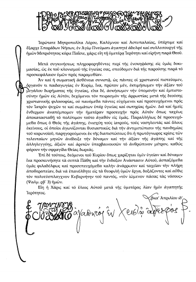 Σε πολύ καλή κατάσταση η υγεία του Μητροπολίτη Καλύμνου – Οι ευχές του Πατριάρχη