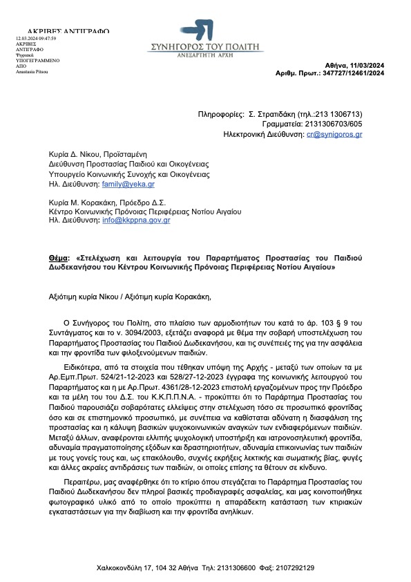 Ο Συνήγορος του Πολίτη, στο πλαίσιο των αρμοδιοτήτων του κατά το άρ. 103 § 9 του Συντάγματος και το ν. 3094/2003, εξετάζει αναφορά με θέμα την σοβαρή υποστελέχωση του Παραρτήματος Προστασίας του Παιδιού Δωδεκανήσου, και τις συνέπειές της για την ασφάλεια και την φροντίδα των φιλοξενούμενων παιδιών.