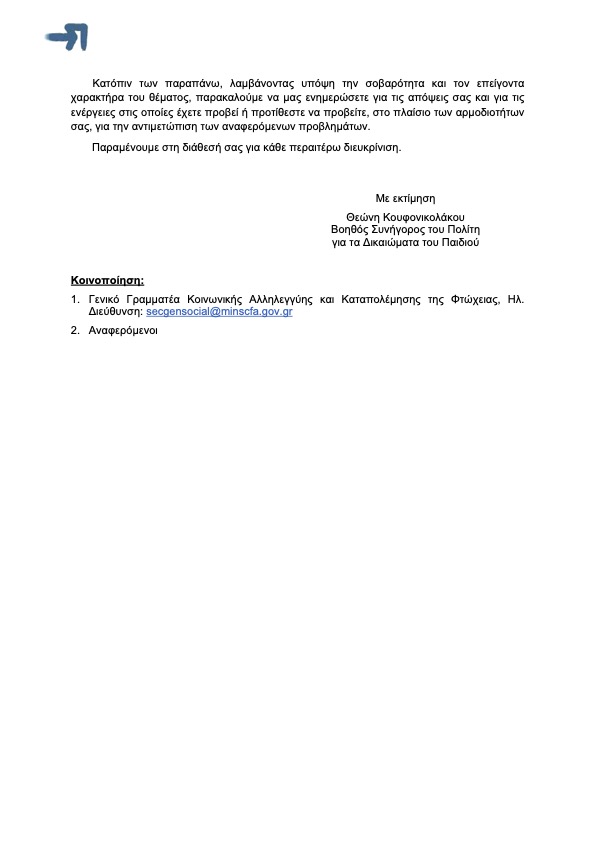 Κατόπιν των παραπάνω, λαμβάνοντας υπόψη την σοβαρότητα και τον επείγοντα χαρακτήρα του θέματος, παρακαλούμε να μας ενημερώσετε για τις απόψεις σας και για τις ενέργειες στις οποίες έχετε προβεί ή προτίθεστε να προβείτε, στο πλαίσιο των αρμοδιοτήτων σας, για την αντιμετώπιση των αναφερόμενων προβλημάτων.