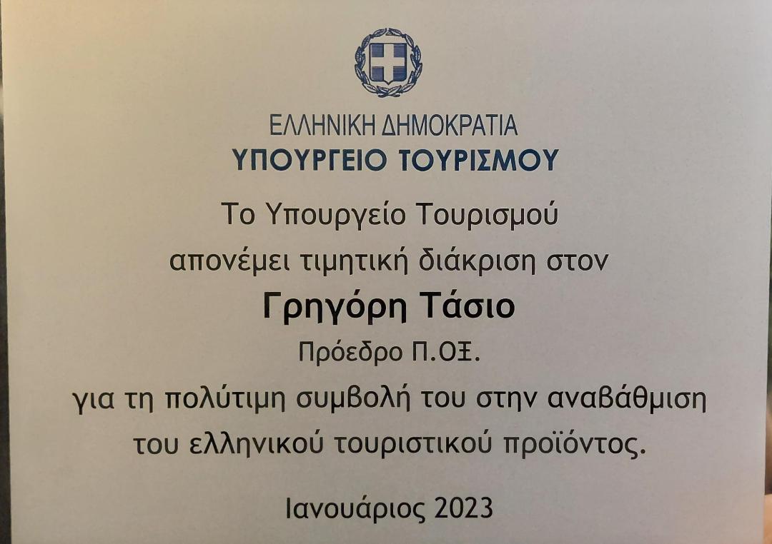 Τιμητική διάκριση στον Πρόεδρο της ΠΟΞ Γ. Τάσιο από το Υπουργείο Τουρισμού