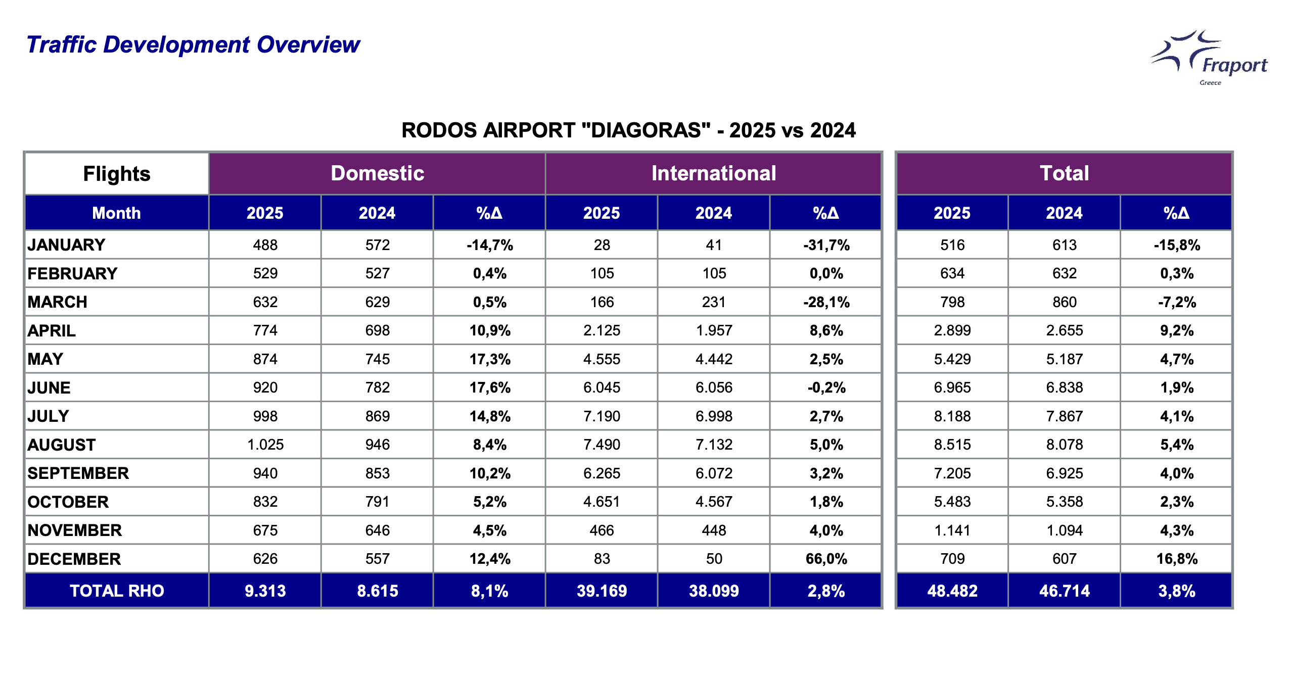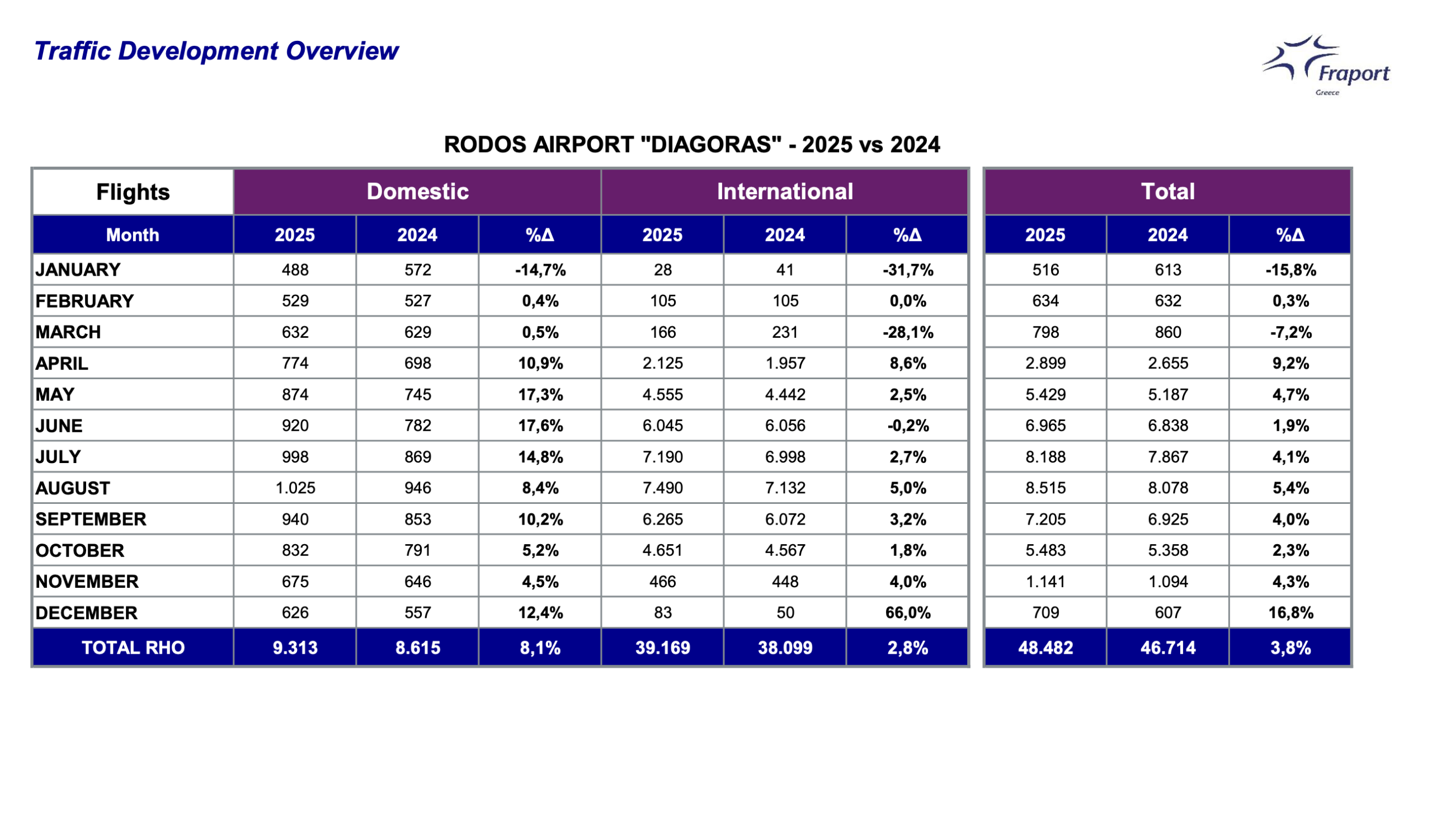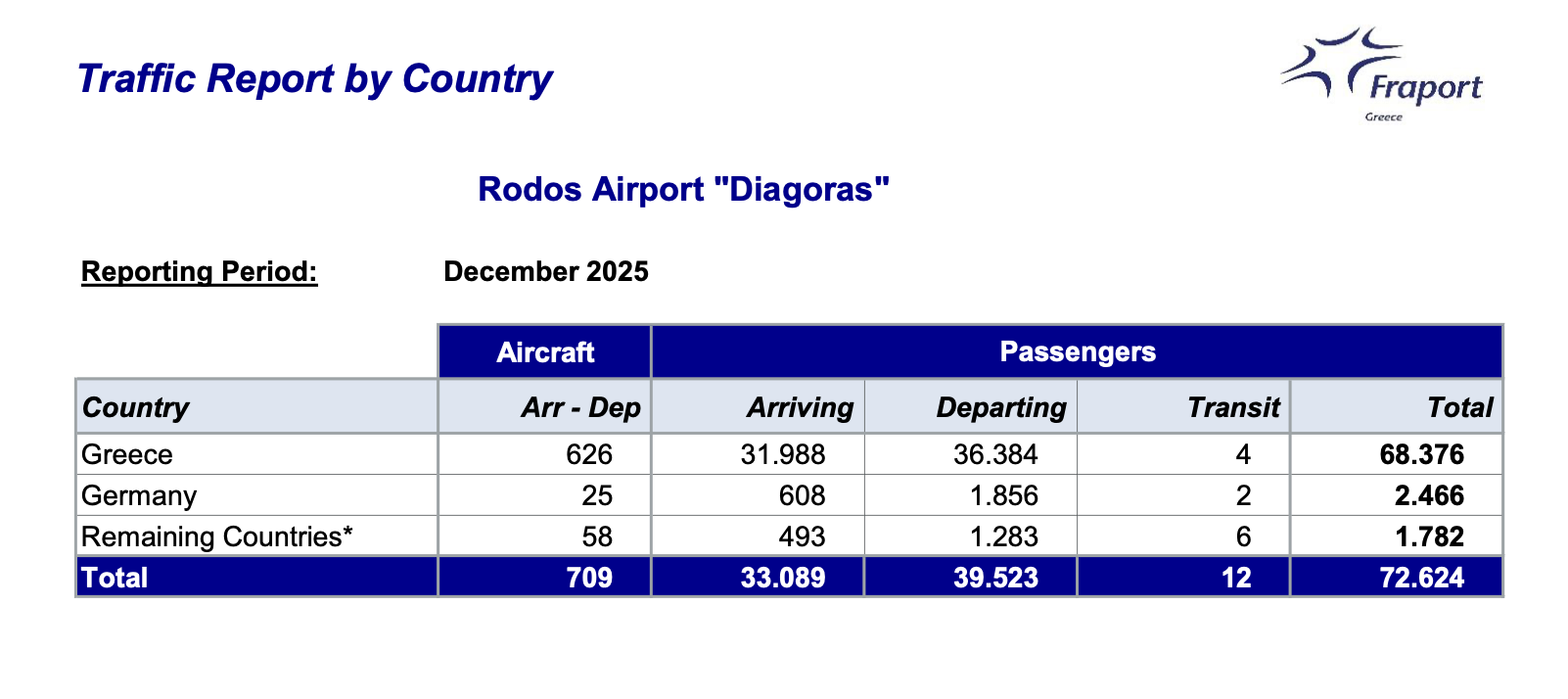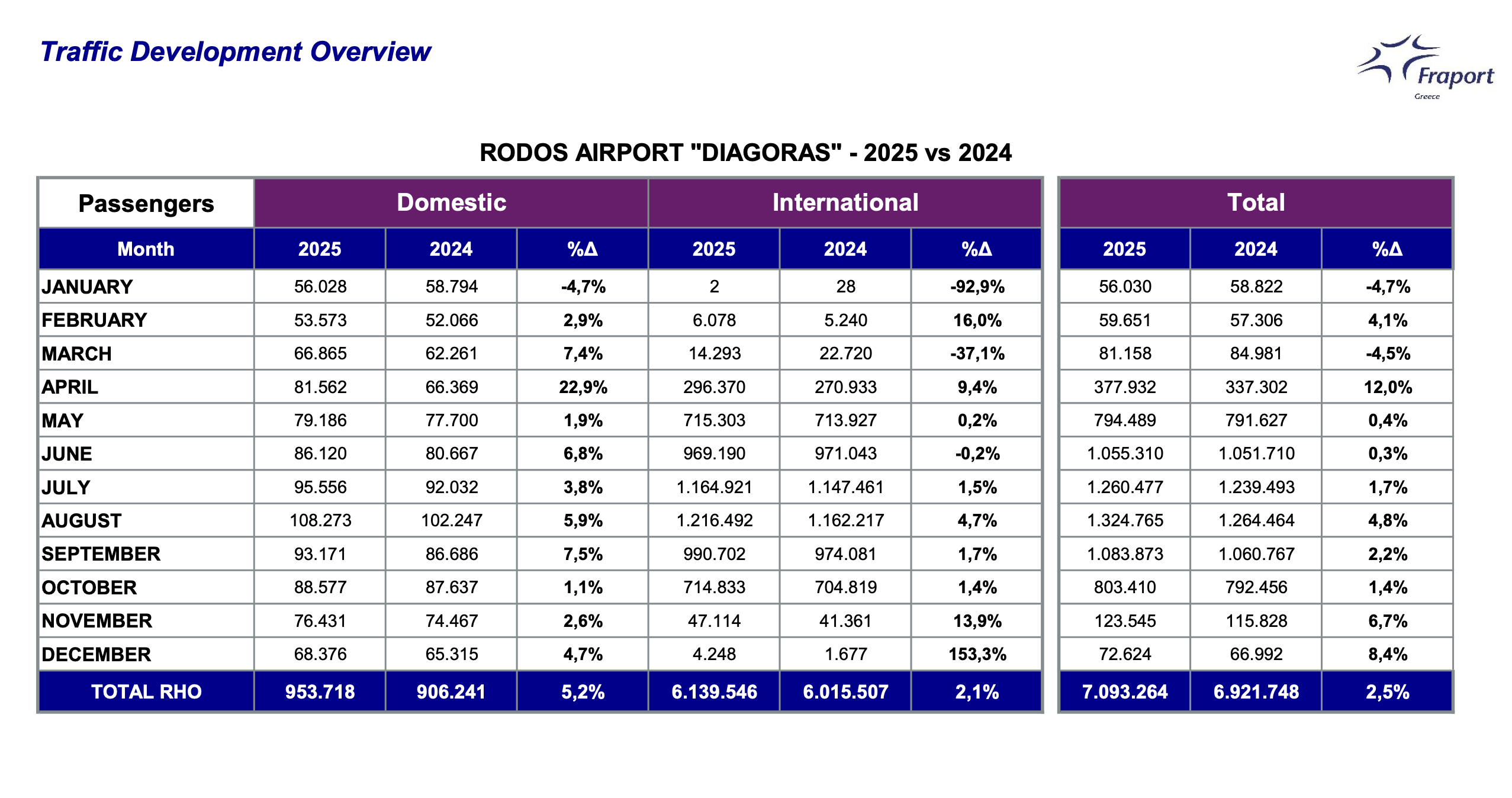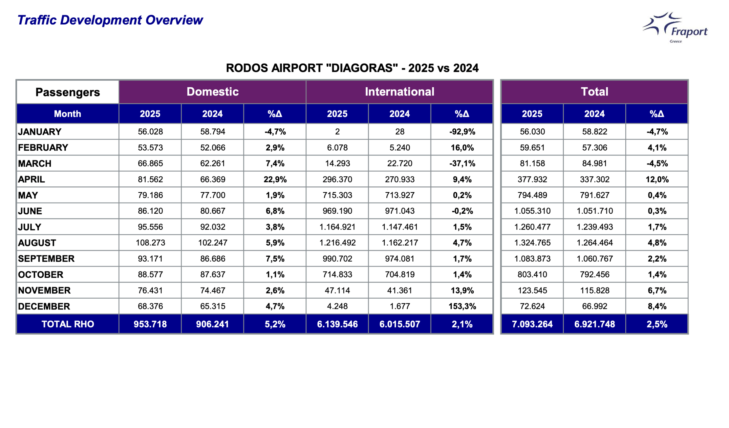 Δεκέμβριος 2025: Τα 14 περιφερειακά αεροδρόμια υποδέχθηκαν περισσότερους από 881.00 επιβάτες, παρουσιάζοντας αύξηση 9,4%, σε σύγκριση με τον Δεκέμβριο του 2024. Σύνολο 2025: Η Fraport Greece το 2025 υποδέχθηκε περισσότερους από 37 εκατομμύρια επιβάτες (37.116.000) σημειώνοντας αύξηση 3%, σε σύγκριση με το έτος 2024. Μάλιστα σε σύγκριση με το 2016 (έτος πριν την παραχώρηση των περιφερειακών αεροδρομίων), όπου τα 14 αεροδρόμια εξυπηρέτησαν συνολικά 25 εκατομμύρια επιβάτες, η αύξηση αγγίζει το 48%. 2017-2025: Συνολικά, περίπου, 250 εκατομμύρια (249,6 εκατομμύρια) επιβάτες διακινήθηκαν μέσω των 14 περιφερειακών αεροδρομίων.