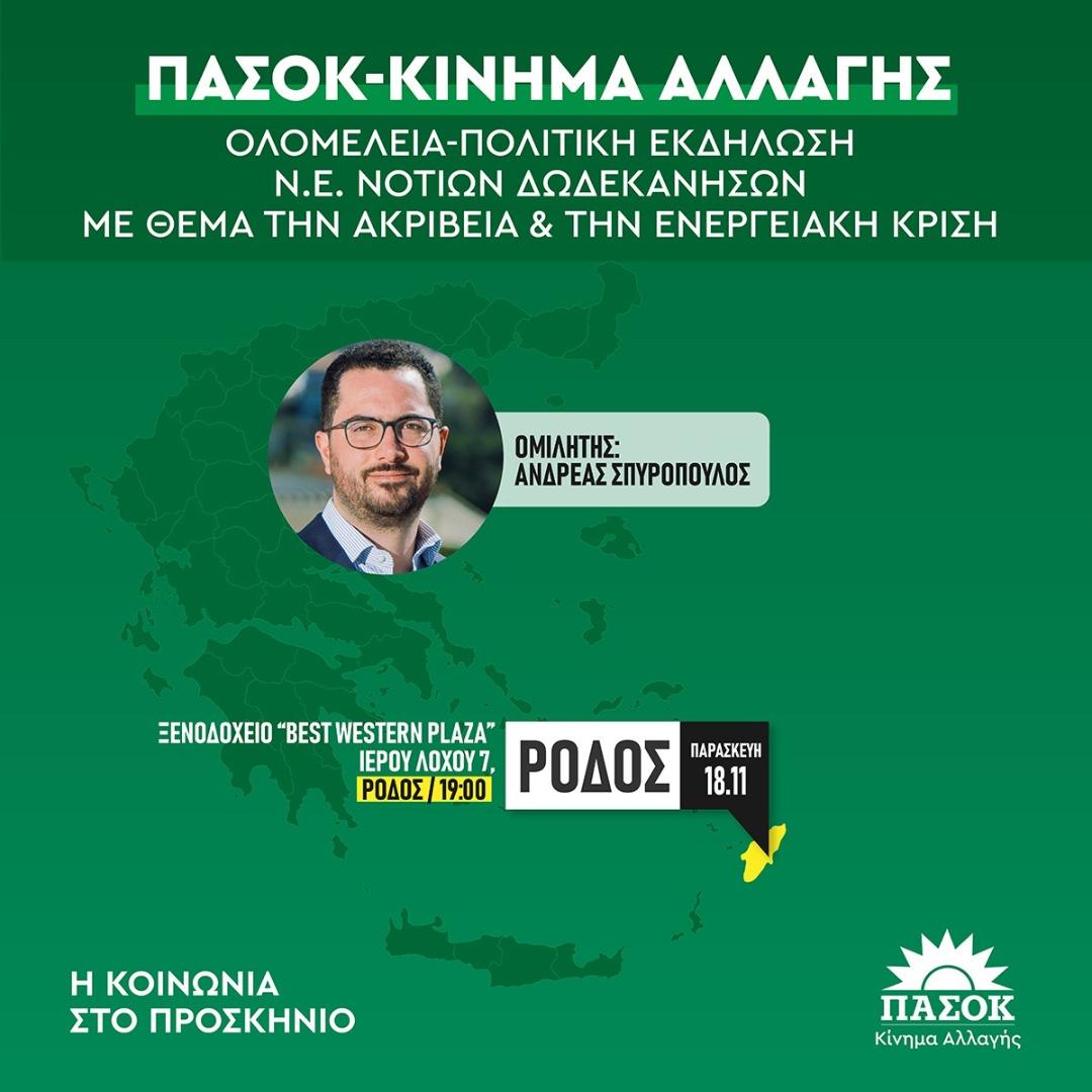 Η Νομαρχιακή Επιτροπή ΠΑΣΟΚ Νοτίων Δωδεκανήσων καλεί τους φίλους και τα μέλη του Κινήματος στην πολιτική εκδήλωση με θέμα την Ακρίβεια και την Ενεργειακή Κρίση.